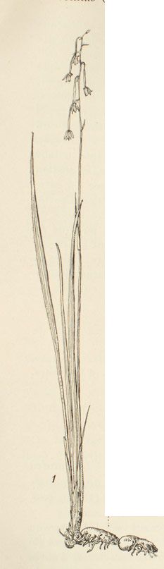 Found in central Madagascar as a medium sized, cool growing terrestrial with subterranean pseudobulbs carrying grass-like, lanceolate-linear, slightly shorter than the inflorescence, heavily plicate, nerved leaves that blooms in the early summer on an erect,peduncle longer than the rachis, with several sheaths, to 14" [35 cm] long overall, several flowered inflorescence carrying pendulous, reflexed flowers
