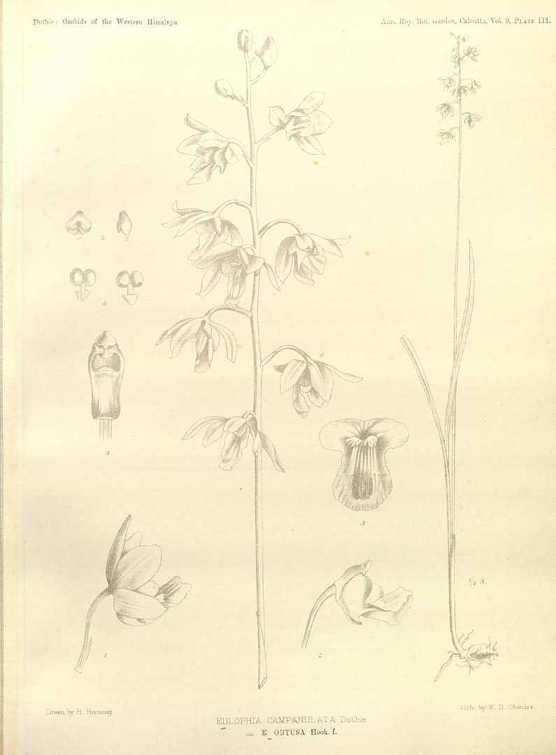 Synonyms *Cyrtopera obtusa Lindl. 1833; Eulophia campanulata Duthie 1902; Graphorkis obtusa (Lindl.) Kuntze 1891; Lissochilus obtusus (Lindl.) Schltr. 1919