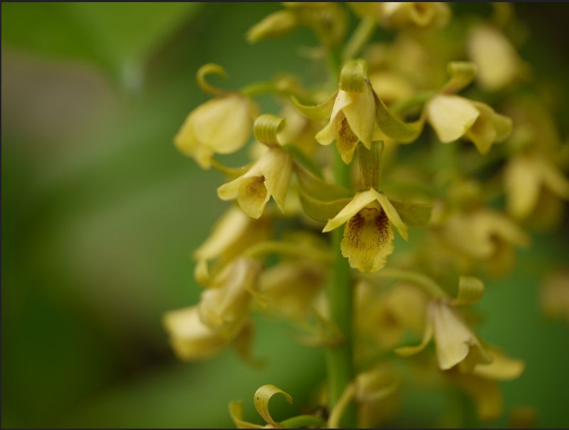 Found in India on slopes and rocky areas of dry-deciduous and moist-deciduous forests at elevations of 100 to 1000 meters as a small sized, warm to cool growing terrestrial with conic-ovoid pseudobulbs giving rise to 2 to 5, basal, oblong-lanceolate to ovate, acute, plicate leaves that blooms with leaves present in the summer and early fall on an erect, peduncle 2 to 3 sheathed, 10 to 18" [25 to 45 cm] long, semi-dense, several to many flowered inflorescence