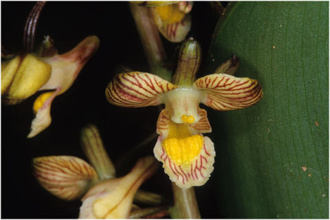 Found in Madagascar in grasslands and among rocks at elevations of 500 to 2000 meters as a medium sized, warm to cool growing terrestrial with subterranean tubers giving rise to 5 to6 grass-like, arising after flowering, acute leaves that blooms in the spring on an erect, peduncle twice as long as the rachis, with 10 sheaths, the lower long, evasive and closely adpressed, the uppers are longer, more distant and looser, 12 to 16" [30 to 40 cm] long, very loosely 15 to 25 flowered inflorescence with acute, up to half as long as the ovary floral bracts.