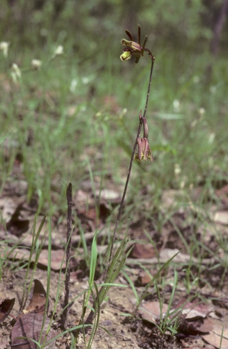 Found in Zaire, Angola, Malawi, Zambia and Zimbabwe in woodlands, rocky hillsides and dry dambos at elevations of 900 to 1500 meters as a small sized, warm to cool growing terrestrial with a partly subterranean, conical, chain-forming tuberous growth giving rise to3 to 5, linear, grass-like leaves that are partially developed at blooming occuring in the spring on 1 to 2, erect, laxly 2 to 5 flowered inflorescence with an ovate bract in the basal half.