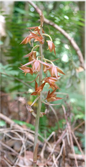 Found in Ogasawara-shoto Islands of Japan as a medium sized, cold growing, mycoheterotrophic terrestrial without leaves that blooms in the late spring and early summer on an erect, 20 to 24" [50 to 60 cm] long, several to many flowered inflorescence.