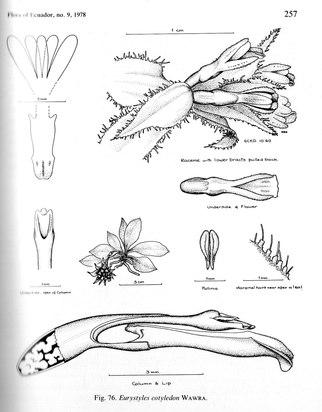 References W3 Tropicos, Kew Monocot list , Die Orchideen der Sudamerikanischen Kordillerenstaaten II Colombia Schlechter 1920 as Trachelosiphon colombianum; Repert. Sp. Nov. Regni. Veg. Beih. 19: 86. Costa Rica Schlechter 1923 as E auriculata; Flora Brasilica Fasc 8 Vol XII II 13-43 Orchidaceae Hoehne 1945; Flora Brasilica Fasc 8 Vol XII II 13-43 Orchidaceae Illustrations Hoehne 1945 drawing good; Flora Brasilica Fasc 8 Vol XII II 13-43 Orchidaceae Hoehne 1945 as E paranaensis Flora Brasilica Fasc 8 Vol XII II 13-43 Orchidaceae Illustrations Hoehne 1945 as E paranaensis drawing good; Iconografia de Orchidaceae Do Brasil Hoehne 1949 drawing fide; Iconografia de Orchidaceae Do Brasil Hoehne 1949 as E paranaensis drawing fide; Venezuelan Orchids Illustrated Vol 3 Dunsterville & Garay 1966 drawing fide; AOS Bulletin Vol 36 #9 1967; Flora de Venezuela Foldats Volumen XV Part 1 1969 drawing fide; Flora de Venezuela Foldats Volumen XV Part 1 1969 drawing ok; Fieldiana Biology, Vol 33, 1st Supple. to the Orchids of Peru Schweinfurth 1970; Orchidaceae Brasilenses Band 1 Pabst & Dungs 1975 drawing fide; Flora of Ecuador No 9 225[1] Garay 1978 as E auriculata; Flora of Ecuador No 9 225[1] Garay 1978 drawing fide; Orchids of Venezuela, An Illustrated Field Guide Vol 1 Dunsterville & Garay 1979 drawing fide; Icones Planetarum Tropicarum plate 106 Dodson 1980 drawing ok; Las Orquedias de El Salvador Vol 3 Hamer 1981 as E auriculata drawing fide/photo ok; Selbyana Vol 10 Orchids of Central America Hamer 1988 as E auriculata drawing fide; Icones Orchidacearum I Plate 27 Hagsater and Salazar 1990; Native Colombian Orchids Vol 2 COS 1991 as E cotiledon photo hmm; Field Guide to the Orchids of Costa Rica & Panama Dressler 1993 as E auriculata; Field Guide to the Orchids of Costa Rica & Panama Dressler 1993 photo fide; Orchids of the High Mountain Atlantic Rainforest in SE Brazil Warren & Miller 1994; Orchids of Venezuela [An illustrated field guide] Vol. 1 Ramiro and Carnevali 2000 drawing fide; Rudolf Schlechter Die Orchideen Band 1C lieferung 41 pg 2565 - 2625 Brieger 2001 photo fide; Native Ecuadorian Orchids Vol 2 Dodson 2001 drawing/photo ok; Native Ecuadorian Orchids Vol 2 Dodson 2001 as E auriculataphoto ok; Orquideas Nativas del Tachira Cesar Fernandez 2003 photo fide; Flora of the Venezuelan Guayana Vol 7 Steyermark, Berry, Yatskievych and Holst 2003 drawing good; Orquideologia Vol. 23 No 2 2004 photo fide; Orquideologia Vol 24 #1 2005 photo fide; Vanishing Beauty, Native Costa Rican Orchids Vol 1 Pupulin 2005 as Eurystyles auriculata photo fide; The Organ Mountains Its History and Its Orchids Miller, Warren, Miller & Seehawer 2008 photo fide; Orchids of Costa Rica Vol 2 Morales 2009 as E auriculataphoto fide; Orchids of Peru Zelenko & Bermudez 2009 photo ok; An Illustrated Field Guide to the Orchids of the Yotoco Forest Reserve Colombia Kolanowska, Escobar, Sanchez & Szlachetko 2011 drawing/photo ok; Orquideas Tesoro de Colombia Ortiz & Uribei 2017 photo ok?; Orquideas de Farallones de Cali Galindo-Tarazona, Haelterman, Zuluaga Trochez and Sebastian Moreno 2020 photo fide