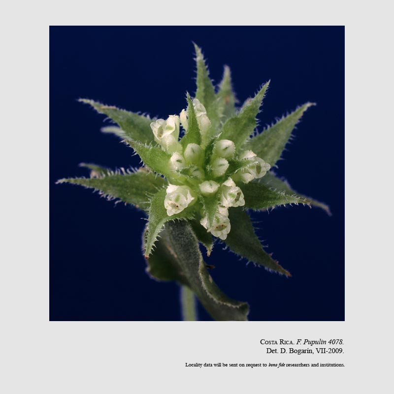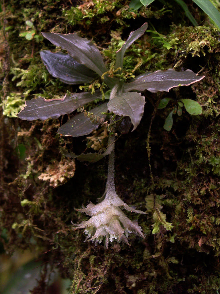 Found in Oaxaca state of Mexico, Guatemala, Costa Rica and Panama at elevations of 1400 to 1500 meters as a mini-miniature sized, cool growing epiphyte with a basal rosette of membraneous, olive green, waxy, elliptic-lanceolate, acute, margins finely and shortly ciliolate leaves that blooms in the winter on a short, densely pubescent, 1.6 to 3” [4 to 7.5 cm] long overall, rachis .6 to 1.2” [1.5 to 3 cm] long, densely many flowered head of close set flowers with rhombic-lanceolate, long acuminate, pilose floral bbracts that are as long as the flowers.