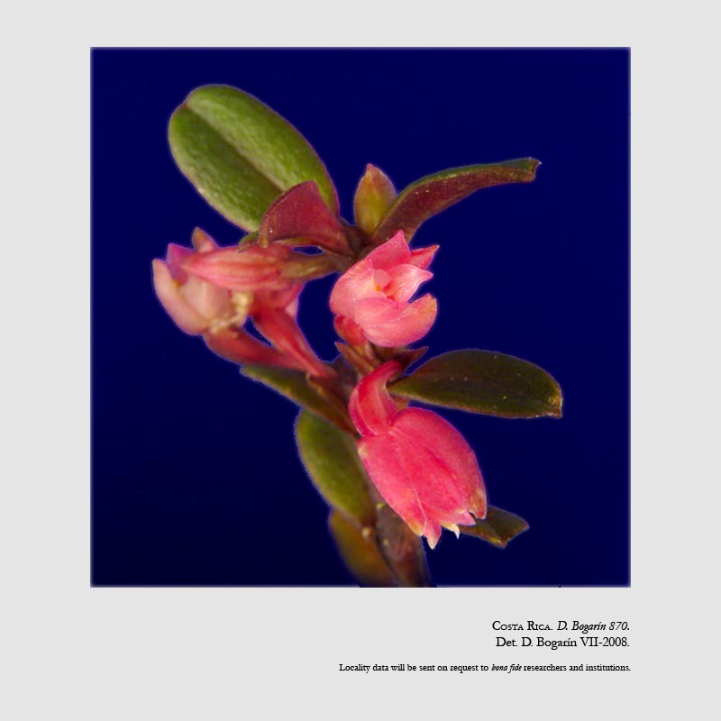 Found in Costa Rica at elevations around 2000 meters as a rare, mini-miniature sized, cool growing epiphyte with somewhat creeping stems carrying very fleshy, green, suffused with purple, keeled below, elliptic, acute leaves that blooms in the fall on a lateral, short, 2 to 3 flowered inflorescence.