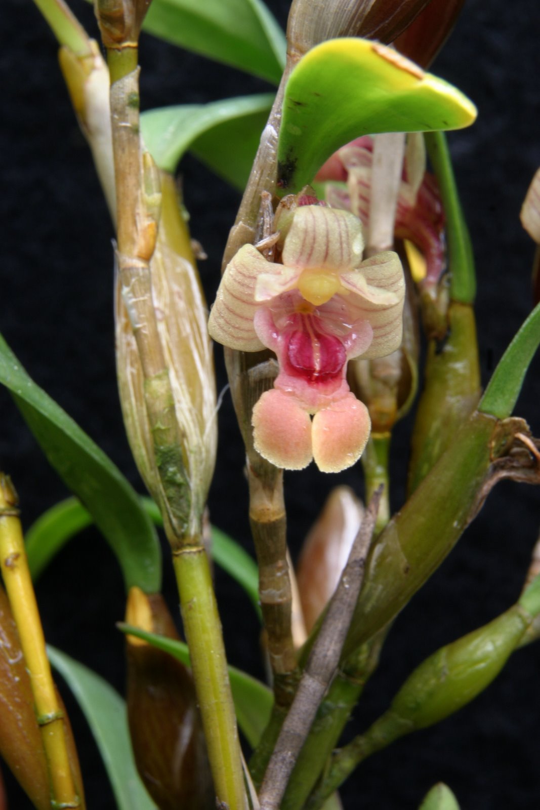 Found in the eastern Himalayas, Thailand, Vietnam, Malaysia, Brunei and Kalimantan Borneo as well as Sumatra in lowlands, hill forests and lower montane forests at elevations of 50 to 1900 meters as a miniature to small sized, hot to cool growing epiphyte with ovate-lanceolate, elliptic in cross-section, shiny yellow green pseudobulbs carrying a single, apical, erect, ovate-lanceolate, obtusely bilobed, shiny above, duller and pale beneath leaf that blooms in the spring on an abaxial, arising through a bright orange bract and carries a single flower.