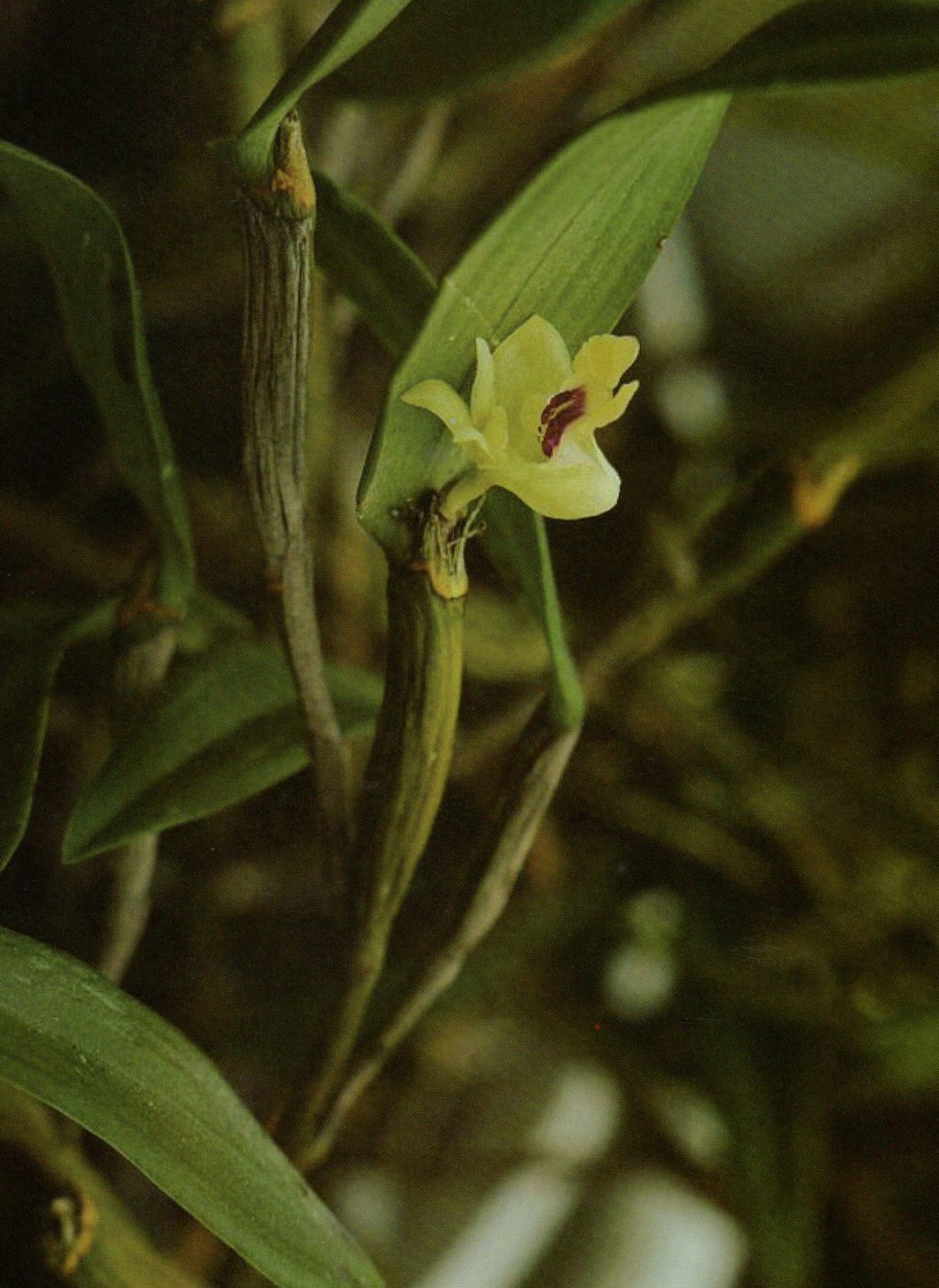 Found in south Yunnan province of China in open forests on tree trunks at elevations around 900 meters as a small sized, warm growing epiphyte with pendulous to ascending, golden yellow, often branching stems with golden yellow, fusiform, slightly compressed pseudobulbs carrying a single, apical, elliptic-lanceolate, leathery, subacute and slightly bilobed apically leaf that blooms in the late spring and early summer on a terminal, very short, successively single, 1 to 5 flowered inflorescence carrying a short lived flower