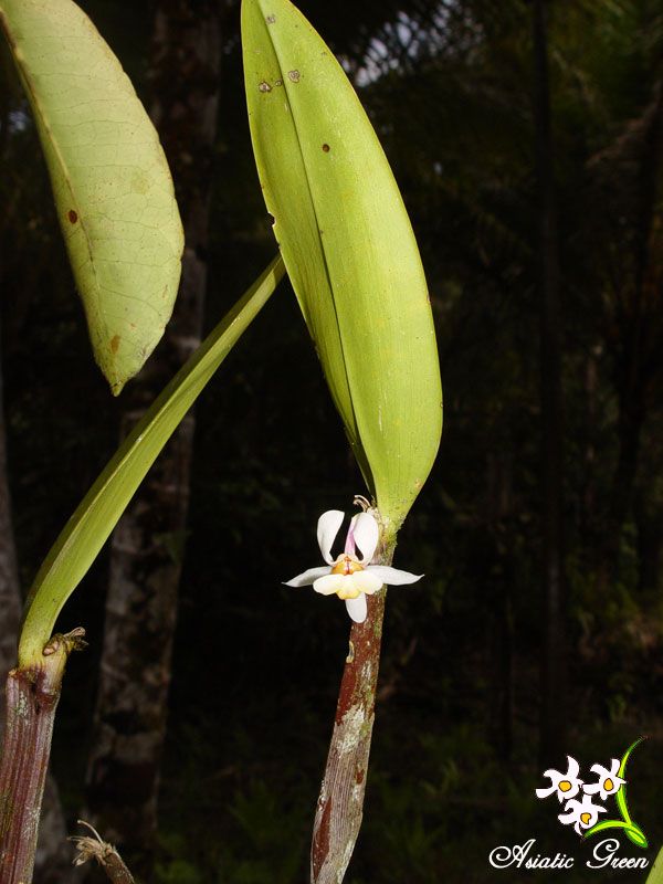 Found in Borneo in mossy lowlands at elevations around 50 to 1200 meters in keragas forests as a hot to cool growing epiphyte with large, razor-edged pseudobulbs carrying a single, apical, elliptic, round apically leaf that blooms at most any time of the year on short, successively single flowered inflorescence carrying long [2 days] lasting [for the genus - 1 day is more normal], strongly fragrant flowers