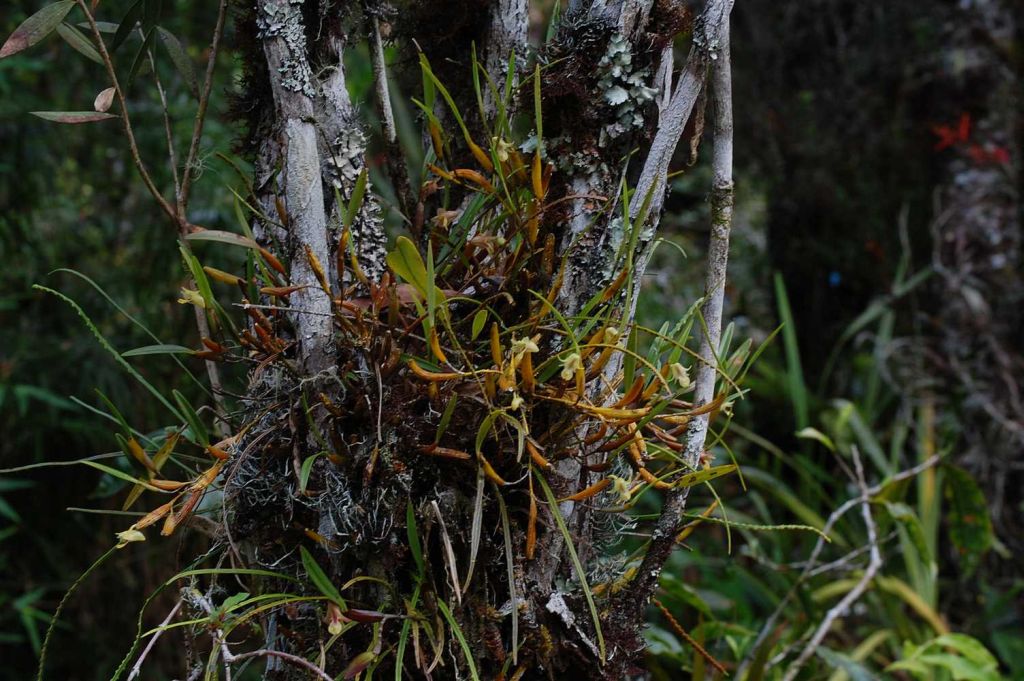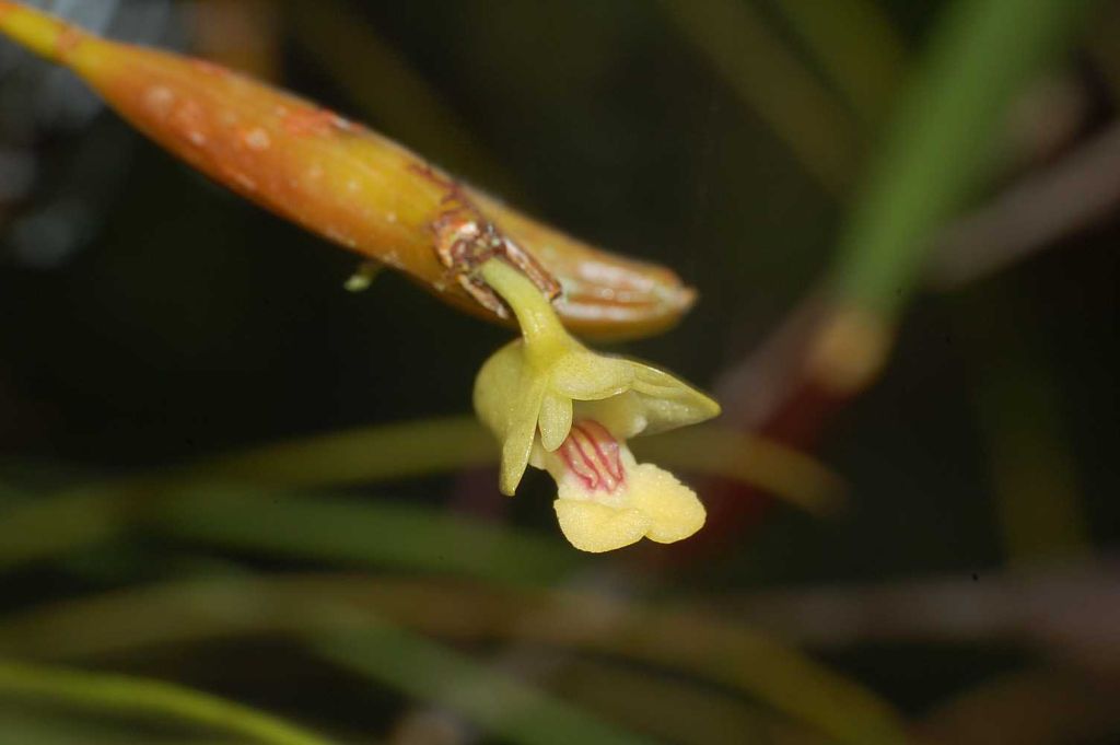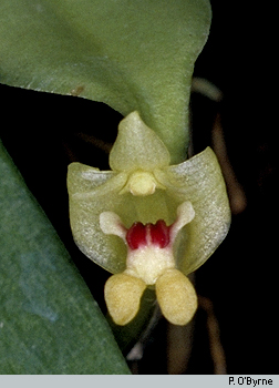 Found from Thailand, Malaysia and Indonesia, to north Australia in mangrove and sago swamps at sealevel and low-lying swamp forest at elevations around 600 to 800 meters, on trunks and branches of trees as a small sized, hot to warm growing epiphyte. It blooms in the fall and winter in nature on a short, single flowered, green inflorescence arising from a deltoid yellow brown bract seated at the leaf axil. The distinctive flower lasts for less than a day. The spindle shaped pseudobulbs are carried on the rhizome about 4" [10 cm] apart. Each pseudobulb has a single oblong, thick, fleshy, obtuse to shortly indented, green to black beneath leaf. Needs to be mounted to accomodate the creeping growth habit.