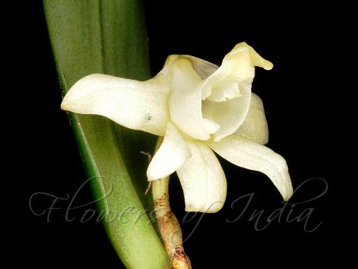 Found in the western Himalayas [Uttaranchal] at elevations around 1500 to 2000 meters as a medium sized, cool growing epiphyte with many stems carrying minutely bilobulate, mid vein terminating in a short, flat mucro in sinus leaves that blooms in the late spring on a single flowered inflorescence with small flowers