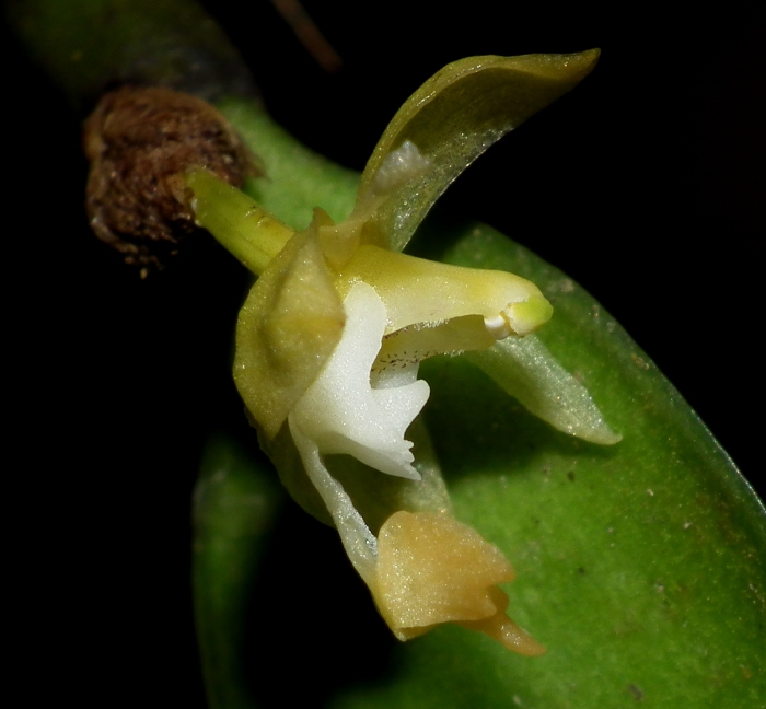 Found in the Philippines at elevations around 800 to 1000 meters as a small, warm growing epiphyte with upright, 2 to 3 noded stems carrying a single apical, leathery, terminal, lanceolate leaf that blooms on a short, single flowered inflorescence arising from the back of the leaf.