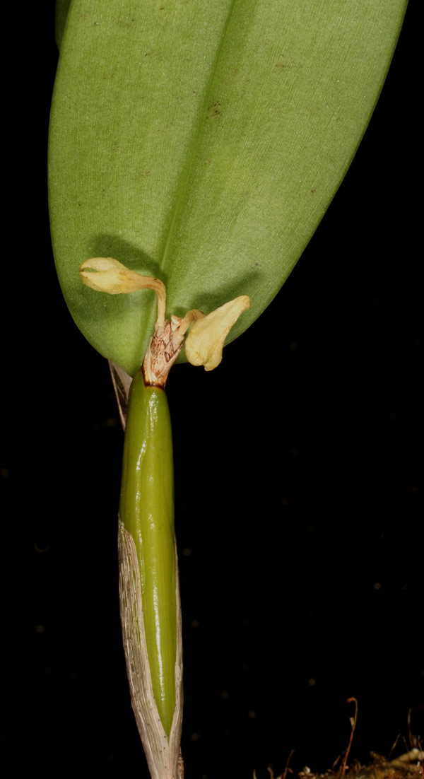 Found in Sulawesi and New Guinea in forests on trunks and branches of trees at elevations of 800 to 1000 meters as a small to medium sized, warm growing epiphyte with a creeping rhizome giving rise to aerial stems at 1.2 to 2" [3 to 5 cm] intervals which bear up to 4 pseudobulbs carrying a single apical, ovate, obtuse leaf that blooms in the summer and fall on 1 to 2, behind the leaf, short, single flowered inflorescence