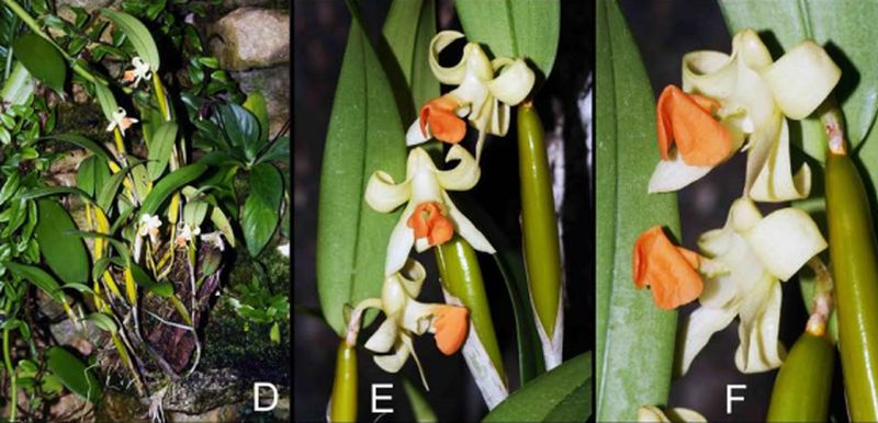 Found in northern Vietnam in primary and secondary broad-leaved, mixed and coniferous evergreen lowland and submontane forests on rocky eroded limestone, commonly on mountain tops at elevations around 250 to 1100 meters as a large sized, hot to cool growing epiphyte or lithophyte with a creeping, few branching rhizome erect, ascending at the base, rigid, simple to few branching, twig-like stems carrying 5 to 6 lateral and one apical, terminal, fusiform, terete, usually slightly recurved, truncate, glossy, yellowish to yellowish-green pseudobulbs and carrying a single, apical, rigid, narrowly ovate to broadly lanceolate, widest in the basal half, acute, entire to shortly bilobed apcailly, sessile basse leaf that blooms in the later spring through summer on a 1to 2 flowered inflorescence arising from beneath the leaf base, from a bundle of many dry, fibrous, overlapping scales placed on the adaxial and abaxial sides of pseudobulb apex and carrying a widely opening, short lived, celery scented flower.