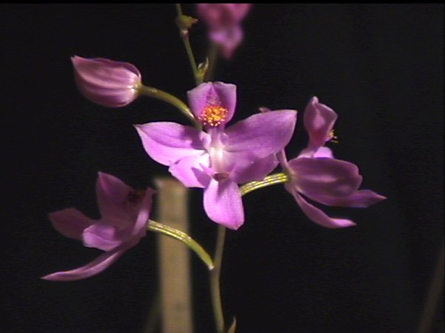I collected this plant in Jamaica but they are widespread in the American tropics and subtropics even being found rarely in Florida, it blooms in the spring and summer, is an intermediate to warm grower found at altitudes up to 1100 meters as an epiphyte in humid forests and citrus groves. It is a small plant with ellipsoid compressed 1/2" pseudobulbs that bear a single apical leaf and 2 to 3, 6" linear or lanceolate, carinate, stiff and imbricate leaves that surround and enfold the rhizome and, a basal, erect, long, branching inflorescence that has numerous flowers that open in succession over months. The color of the flowers ranges from white to pink, lavender to purple and are quite a site in full bloom.