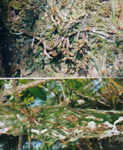 A native of Florida south through the Guineas that blooms in late spring, commonly called the cigar orchid because of it's pseudobulb's shape, it has deciduous leaves that it loses in the fall ,and thus should have less water in the winter, than when it is growing. The inflorecense appears just after the new lead for a pseudobulb begins to appear. This species is a warm growing epiphyte or sometimes terrestrial found on dead or living trees, logs and stumps or in soil between rocks or on boulders at altitudes up to 1400 meters. A paste is made for bookbinding by extracting the juices from the psudobulbs.