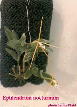 Synonyms Amphiglottis nocturna [Jacq.] Britt.; Auliza nocturna [Jacq.]Small; Epidendrum bahiense Rchb. f.; Epidendrum buenaventurae F. Lehm. & Kraenzl.; Epidendrum carolinianum Lam.; Epidendrum carpophorum Barb. Rodr.; Epidendrum discolor A. Rich & Gal.; Epidendrum leucarachne Schltr.; Epidendrum nocturnum var. angustifolium Stehlé; Epidendrum nocturnum var. minor Schltr.; Epidendrum nocturnum var. minus Cogn.; Epidendrum nocturnum var. tridens (Poepp. & Endl.) Cogn.; Epidendrum oliganthum Schltr.; Epidendrum spruceanum Lindl.; Epidendrum tridens Poepp. & Endl.; Nychosma nocturna [Jacq.]Raf.; Nyctosma nocturna [Jacq.]Raf.; Phaedrosanthus nocturnus [Jacq.]O.Ktze.