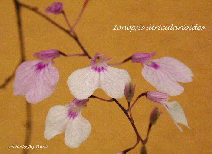 Synonyms Cybelion pallidiflorum (Hook. f.) Spreng.; Cybelion pulchellum (Kunth) Spreng.; Cybelion tenerum (Lindl.) Steud.; Cybelion utriculariae (Sw.) Spreng.; Dendrobium utricularioides [Sw.]Swartz; Epidendrum calcaratum Sessé & Moc.; Epidendrum crenatum Vell.; *Epidendrum utricularioides Sw.; Iantha pallidiflora Hkr.; Ionopsis gardneri Lindl.; Ionopsis pallidiflora Lindley; Ionopsis paniculata Lindl.; Ionopsis pulchella Kunth; Ionopsis tenera Lindley; Ionopsis zonalis Lindley & Paxt.