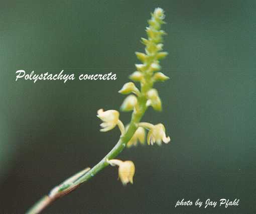 Synonyms Callista flavescens (Lindl.) Kuntze; Cranichis luteola Sw.; Dendrobium flavescens Lindley; Dendrobium polystachyon Sw.; Dendrorchis minuta O. Ktze.; Dendrorchis tessellata (Lindl.) Kuntze; *Epidendrum concretum Jacq.; Epidendrum minutum Aubl.; Onychium flavescens Blume; Polystachya flavescens Lindley; Polystachya luteola [Sw.]Hooker; Polystachya mauritiana Sprengel; Polystachys minuta Britton; Polystachys modesta Rchb.f.; Polystachys tesselata Lindley