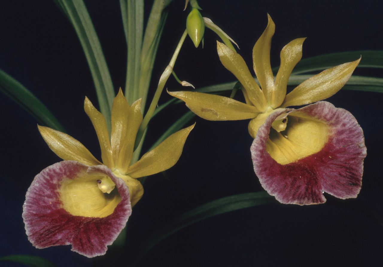 This is a medium sized, warm to cool growing epiphyte found on trees in pine lands and in open forests usually on palms and found at elevations of 800 to 1200 meters in altitude. They can grow into large clumps and are only found in Colombia, Bolivia and Peru as well as Fr Guiana, Surinam and northern Brazil with closely spaced on the rhizome, fusiform, elongate, 10" [25 cm] pseudobulbs enveloped by several, imbricating, scarious sheaths with 8 or so leaves, linear-lanceolate, pointed, basally clasping, coriaceous yet flexible with prominent veining. It has an apical, curving, often branched, to 12" [30 cm] long, lax, pendulous inflorescence arising on a newly matured pseudobulb with a few long-lasting, fragrant, funnel shaped flowers that open in succession in the spring through early summer.
