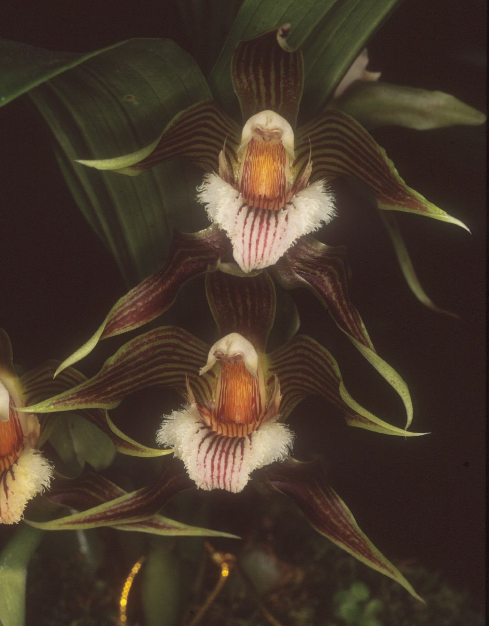 Found in Colombia and Venezuela in primary forests at elevations of 100 to 1600 meters in rain forest on tree trunks in shade as a medium sized, hot to cool growing epiphyte or rarely lithophyte with clustered, ovoid, rugose pseudobulbs enveloped basally by imbricate, distichous, acute sheaths and carrying 2 apical, oblanceolate, plicate, acute to acuminate, petiolate leaves that blooms in the winter and early spring on an erect, basal, 5 1/5" to 8 3/4" [13 to 22 cm] long inflorescence arising on a newly maturing pseudobulb with rigid, lanceolate, acuminate floral bracts carrying 2 to 3, fleshy flowers.