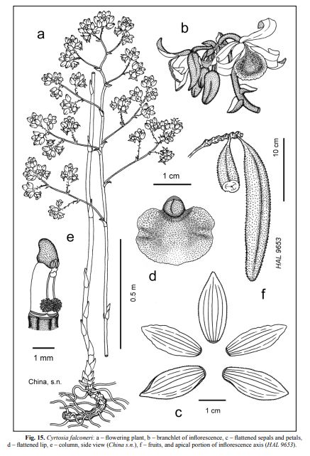 References W3 Tropicos, Kew Monocot list , IPNI ; The Orchids of Sikkim-Himalaya Part 1 King & Pantling 1898 drawing ok; The Orchids of North-Western Himalaya Vol IX Part II Duthie 1906; Indian Orchids, Guide to Identification and Culture Pradhan 1976 drawing fide; Orchids of Bhutan Pearce & Cribb 2002 drawing ok/photo good; Orchids of India A Glimpse Misra 2007; Flora of China Vol 25 Zhengyi & Deyuan 2009; Turczaninowia 2011, 14(2) : 15–100 Averyanov 2011 as Cyrtosia falconeri drawing/photo fide; LANKESTERIANA 15(1): 7—50. Jeewan Singh Jalal & J. Jayanthi 2015 photo fide