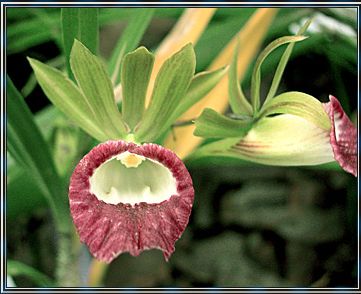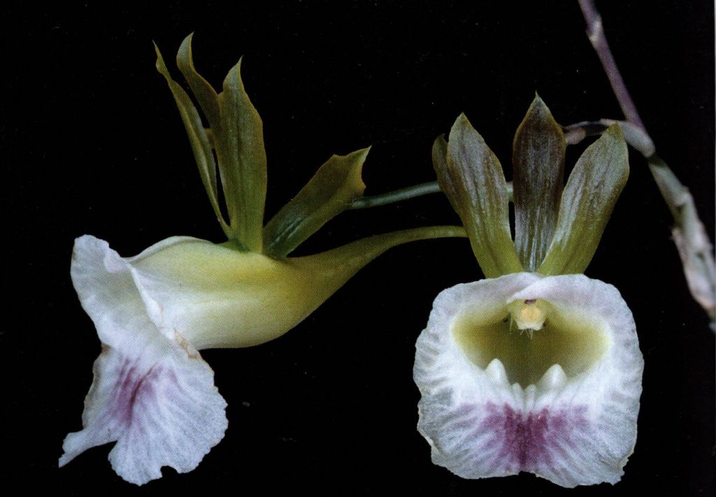 Found in Venezuela to northern Brazil in wet forests at elevations of 50 to 200 meters as a medium to large sized, hot growing epiphyte with slender, erect, fusiform pseudobulbs enveloped completely by leaf bearing sheaths that, after leaf fall, dry and are persistent and carrying several, deciduous, two ranked, thin, plicate, linear, 3 nerved, basally clasping, acute leaves that blooms in the late spring on a just developed, almost mature pseudobulb that arose less than 2 months before, terminal, erect then arching, slightly fractiflex, several [8] flowered inflorescence arising through a narrowly linear, elongate, acute spathe and carrying wide open flowers that have a very elongate, acute, spur.