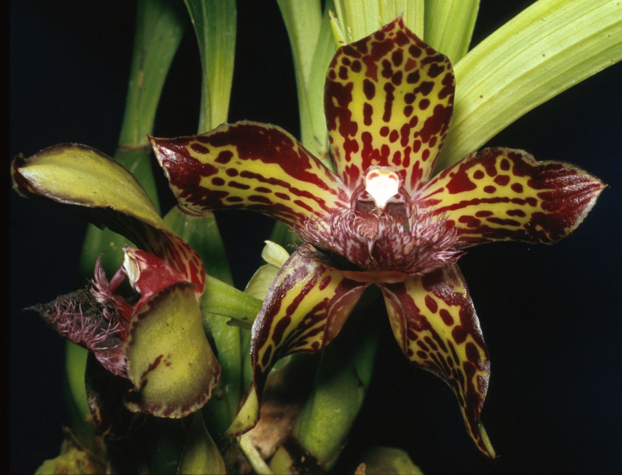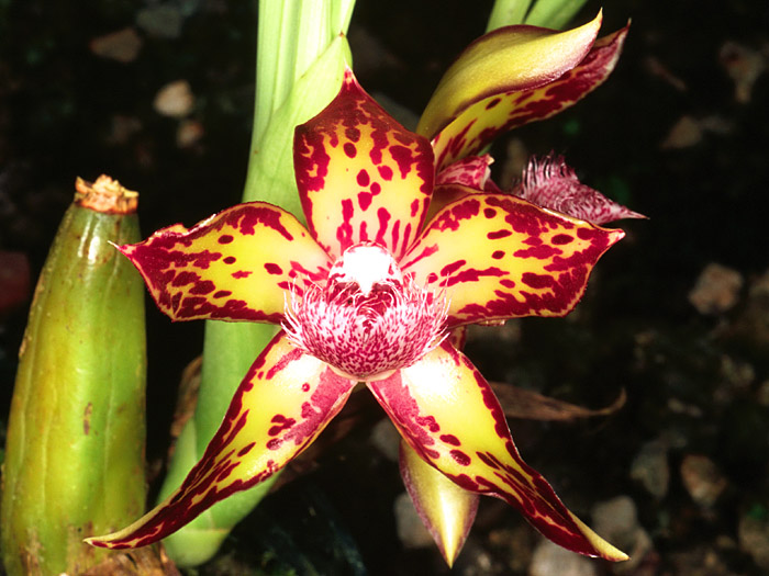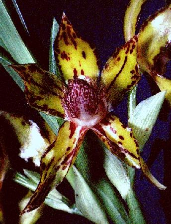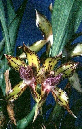 A hot to warm growing, medium sized, epiphytic orchid that is found in Colombia with pseudobulbs that have 2 basal sheaths and carries erect-patent, lanceolate-ligulate leaves that are attenuate into the petiolate base and blooms in the summer a basal, 1.6" [4 cm] long, 2 to 5 flowered, lateral inflorescence that has ovate lanceolate bracts and arises with the new leaves.