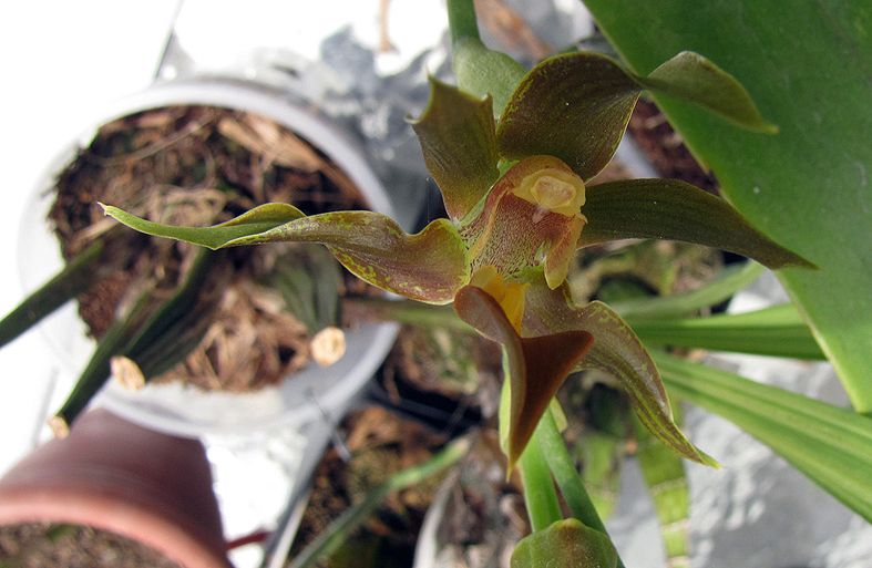 Found in Peru in wet montane forests at elevations around 1200 to 1300 meters as a medium sized, cool growing epiphyte with oblong-ovoid, tapered, lightly compressed, sulcate with age pseudobulbs subtended by deciduous, imbricate bracts becoming foliaceous above and carrying 2, oblong-lanceolate, attenuate into the conduplicate, acute, petiolate base leaves that blooms in the later fall through earlier winter on a basal, 11.2" [28 cm] long, few flowered inflorescence held at a right angle to the pseudobulbs with subequal, ovate, acute, half the length of the ovary floral bracts. .