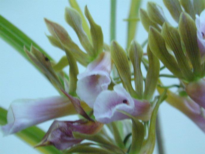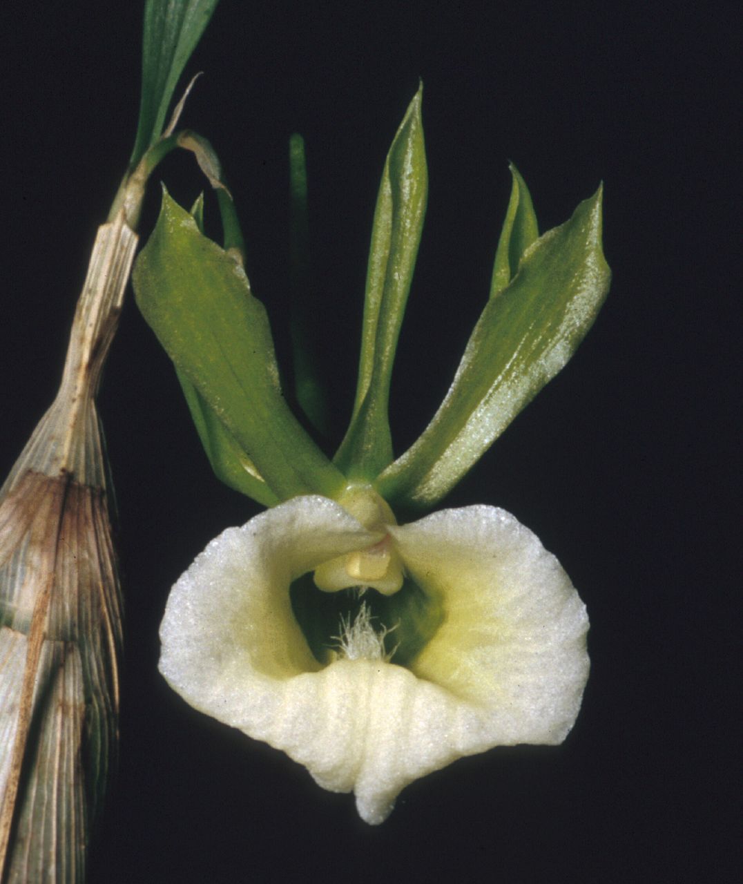 Found in Colombia, Venezuela, Peru and Brazil in moist lowland forests at elevations around 50 to 200 meters in hot tropical rainforests as a small sized, hot growing, caespitose epiphyte with fusiform pseudobulbs enveloped by imbricating, scarious, acute sheaths, leafless below, and above carrying apical, deciduous, narrow spear-like, basally claping leaves that blooms in the fall through winter with a terminal, 1 5/8" [4 cm] long, fractiflex, racemose inflorescence, and can have an occasional basal, lateral branch, with triangular, tubular floral bracts with fragrant, long lasting, variable in color, successively single flowers arising on a mature pseudobulb.