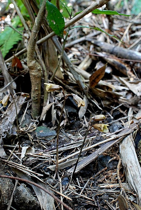Found in northern Taiwan in bamboo forests as a mini-miniature sized, warm to cool growing, mycoheterotrophic terrestrial without leaves with a flexuous, cylindric, slender rhizome giving rise in the winter on an erect, pale brown, to 4" [10 cm] long, 1 to 3 flowered inflorescence with 3 to 4, amplexicaul, below the middle sheaths and acute apically, much shorter than the ovary floral bracts
