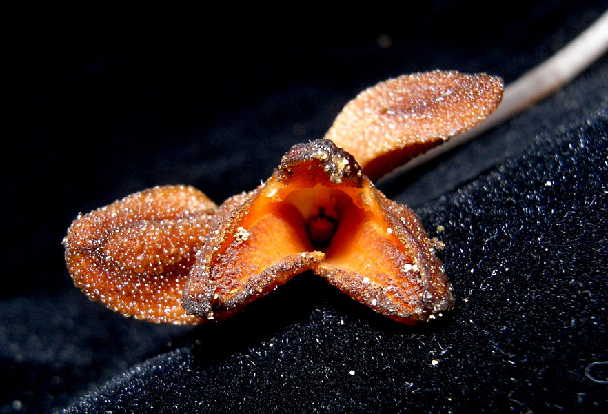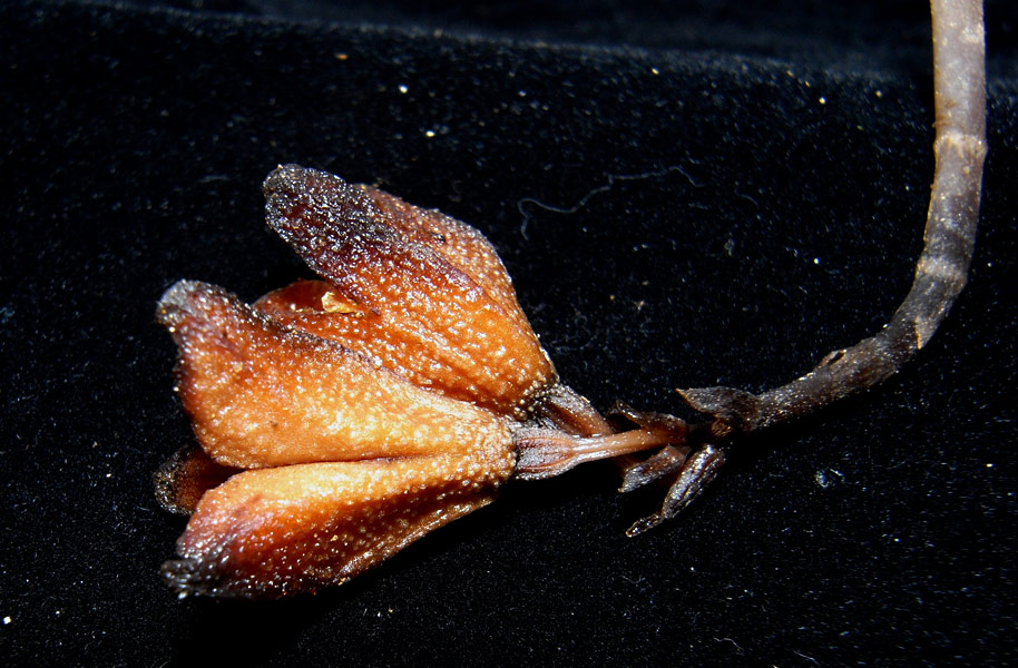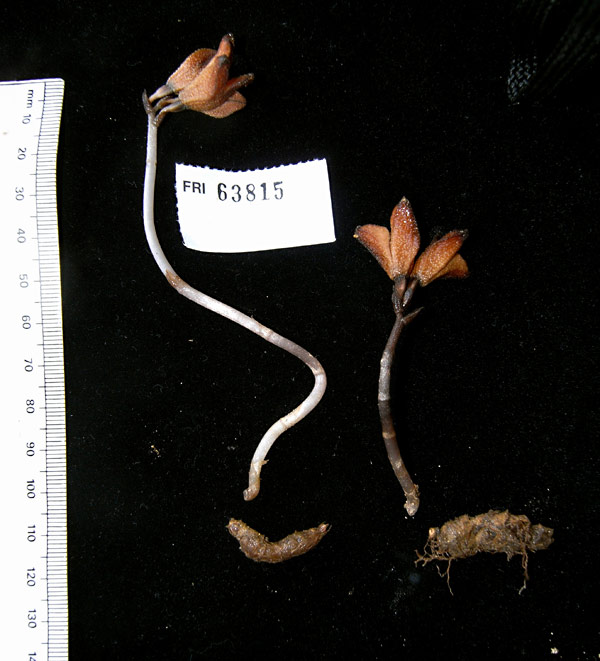 Found in penninsular Malaysia at elevations around 400 meters as a miniature [in flower] to medium [in fruit] sized, hot growing, mycoheterotrophic terrestrial orchid with constricted at intervals tubers giving rise in the spring to a 4" [10 cm] long, erect, 1 to 4 flowered inflorescence carrying drooping flowers that last a single day.