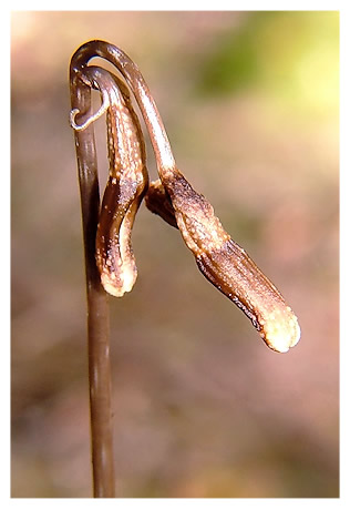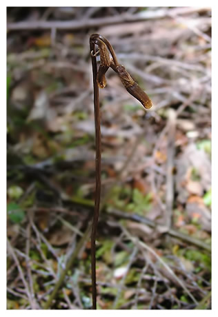 Found in New Zealand in lowland to montane forests as a mini-miniature to small sized, cool to cold growing mycoheterotrophic terrestrial with no leaves and only a very few, small scale leaves widely spaced up the stem that blooms in the later spring and summer on a slender, brown, smooth, erect, 3 to 10 flowered inflorescence carrying flowers that barely open.