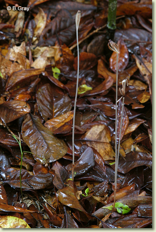Found in Queensland Australia in shady locations within lowland rainforests at elevations of 10 to 400 meters as a mini-miniature sized, hot growing, mycoheterotrophic terrestrial orchid without leaves that has an erect, 12 to 28" [30 to 70 cm] long, dark purple, white flecked, slender, fleshy stem that blooms in the mid spring through early summer on an erect, 6 to 12 flowered inflorescence