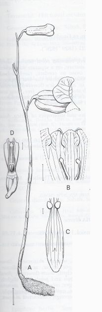 Found in northern Borneo in hill forests at elevations around 1100 meters as a miniature to small sized, cool growing mycoheterotrophic terrestrial with a villous, cylindrical tuber giving rise to an erect, simple stem enveloped by imbricate tubular sheaths that blooms on a 2 to 3 flowered inflorescence with adpressed to the pedicel and carrying resupinate, campanulate, white flowers with orange petals and a greenish brown lip.