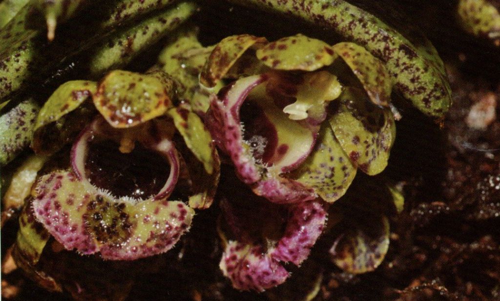 Found in northwestern Yunnan province of China at elevations around 3200 meters as aa miniature sized, cold growing epiphyte with a creeping, pendent stem carrying many distichous, ovate to oblong, purple brown spotted, acute, apically awned leaves that blooms in the later spring on an axillary, short, peduncle .4" [1 cm] long, subumbellate, 2 to few flowered inflorescence with ovate-triangular floral bracts.