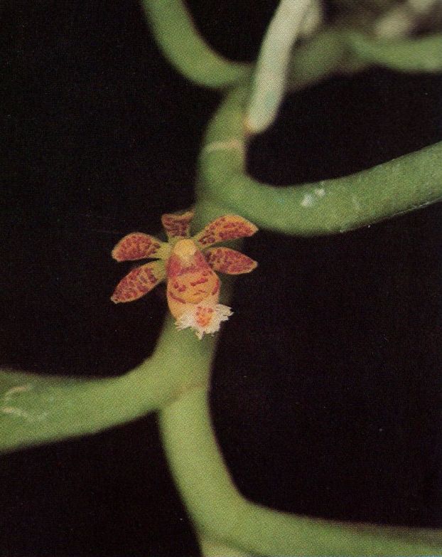 Found in the eastern Himalayas, Sikkim, Bhutan and south eastern Tibet on tree trunks in forests at elevations around 1600 meters as a small to just medium sized, pendent, cool growing epiphyte with a pendent, branching, slender, stem carrying distichous, well spaced, linear, falcate, 3 needle-like apical points, acuminate, leaves that blooms in the later summer on a slender, peduncle .4 to .6" [1 to 1.5 cm] long, sub-umbellate, 3 to 4 flowered inflorescence with ovate acute floral bracts and carrying small, widely opening flowers
