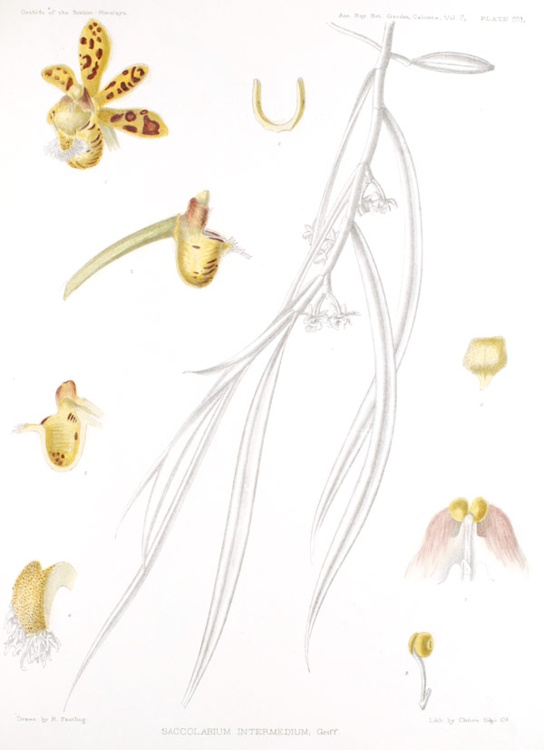 References W3 Tropicos, Kew Monocot list , IPNI ; The Orchids of Sikkim-Himalaya Part 1 King & Pantling 1898 as Saccolabium intermedium not = G linearifolius - drawing fide; A Guide to Identification and Culture Vol 2 Pradhan 1979 as G internedius not = G linearfolius drawing fide; AOS Bulletin Vol 54 #9 1985 as G intermedius photo fide; Orchids of Bhutan Pearce & Cribb 2002; Flora of China Vol 25 Zhengyi, Raven & Deyuan 2009; A Century of New Orchid Records in Bhutan Royal Government of Bhutan 2017 as G cf linearifolius drawing fide/photo not; Three new synonyms in Gastrochilus (Orchidaceae) with notes on typification of Gastrochilus calceolaris and misreport of Gastrochilus changjiangensis from India Bhattacharjee, Agrawala, Jalal and Deori 2021 Photo fide