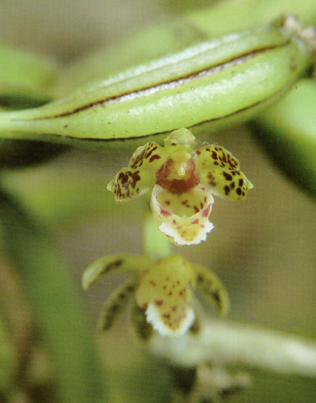 Found in southeastern Yunnan province of China at elevations around 1300 meters as a miniature sized, cool growing epiphyte with an erect stem carrying many distichous, slightly obliquely lanceolate, articulate leaves that blooms in the spring on an axillary, short, 1.2" [3 cm] long, subumbellate, several flowered inflorescence with elliptic floral bracts.