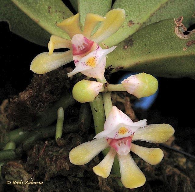 Found in the eastern Himalayas, Bhutan, Sikkim, Myanmar, northern Thailand, southern China, northern Laos and Vietnam in dense forests at elevations of 800 to 1400 meters as a miniature sized, warm to cool growing orchid with a very short stem carrying persistent, linear-oblong to obovate-oblong, bifid, bright green leaves and blooms in the fall and winter on an axillary, drooping, subcorymbose, racemose, to 8 flowered inflorescence with basal tubular sheaths and broad, obtuse floral bracts and carrying fragrant, long-lived flowers.