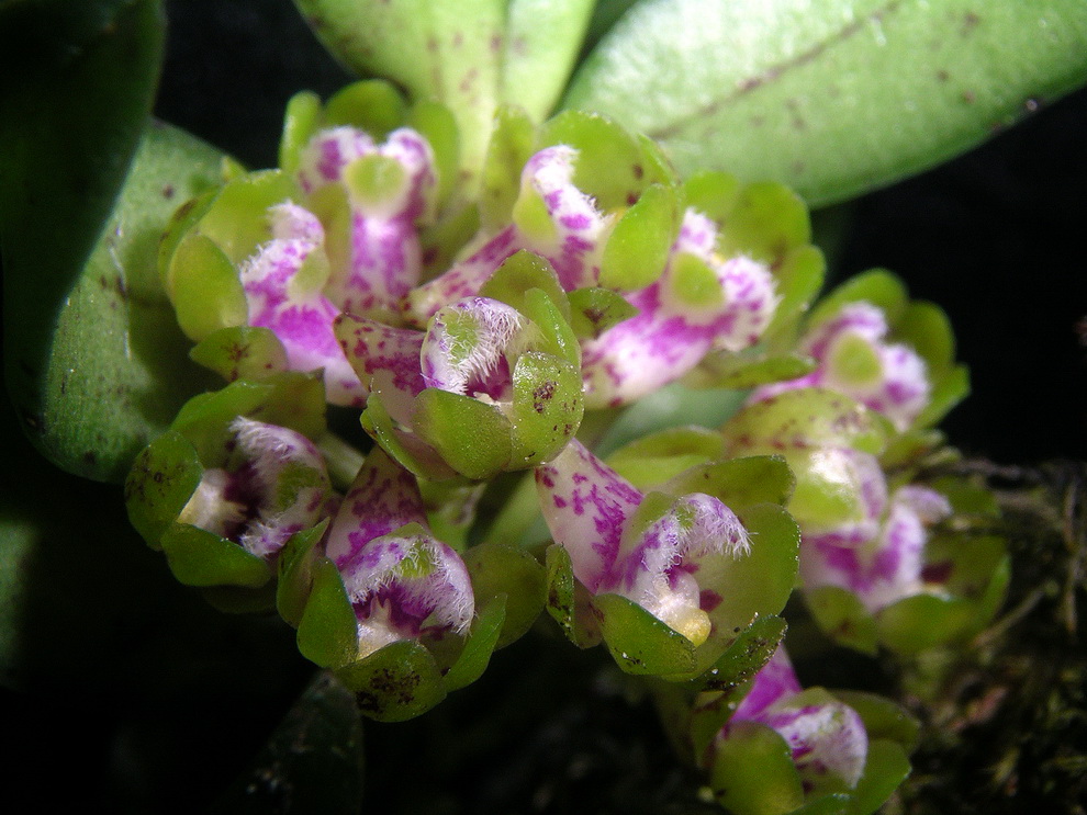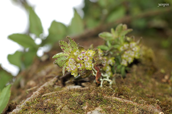 Found in Taiwan in coniferous forests on tree trunks at elevations around 1500 to 2200 meters as a miniature sized, cool to cold growing epiphyte with a creeping, slender stem carrying many distichous, yellowish green often with red spots on both sides, oblong to lanceolate, acute, 3 awned apically leaves that blooms in the winter on a short, 3 to 7 flowered, subumbellate inflorescence.