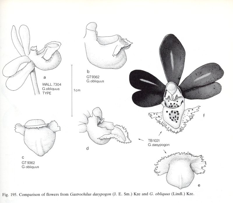 The Orchids of Sikkim-Himalaya Part 1 King & Pantling 1898 as Saccolabium dasypogon drawing ok; The Orchids of Thailand Seidenfaden & Smitinand 1963 drawing]photo fide; The Orchids of Thailand Seidenfaden & Smitinand 1965 corrections; AOS Bulletin Vol 36 #10 1967 photo fide; Beautiful Thai Orchid Species Kamemoto & Sagarik 1975 photo fide; AOS Bulletin Vol 47 No 7 1978 as Saccolabium dasypogon; Indian Orchids: A Guide to Identification and Culture Vol 2 Pradhan 1979; AOS Bulletin Vol 49 No 1 1980 photo fide; AOS Bulletin Vol 54 No 9 1985; Opera Botanica #95 Seidenfaden 1988 drawing fide; Rudolf Schlechter Die Orchideen Band 1B lieferung 19/20 1129 - 1264 Brieger 1988 drawing hmm; Thai Orchid Species Rakpaibulsombat 1992 as G obligus sic photo fide; The Manual Of Cultivated Orchid Species Bechtel, Cribb & Launert 1992 drawing fide; Orchid Flora Of Kamrup District Assam Iswar Chandra Barua 2001 drawing fide; Orchids of Bhutan Pearce & Cribb 2002; AOS Bulletin Vol 74 No 4 2005 photo fide; Orchids of India A Glimpse Misra 2007 drawing ok; Genera Orchidacearum Vol 6 Epidendrodeae Part 3 Pridgeon, Cribb, Chase and Rasmussen 2014
