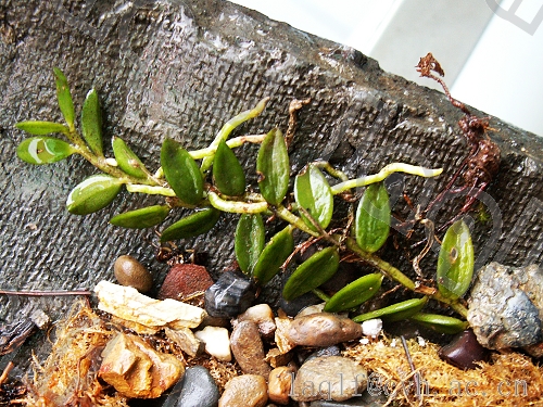 Found in northern Fujian, northeastern Guizhou and northwestern Yunnan provinces of China in forests on tree trunks or on rocks along valleys at elevations around 800 to 3200 meters as a miniature to small sized, cool to cold growing epiphyte with a repent, slender stem carrying distichous, well spaced, green with purple red spots, elliptic to oblong, acute, 3 awned apically leaves that blooms in the fall on 2 to 3, .4" [1 cm] long, 2 to 3 flowered, subumbellate inflorescence with the upper part enlarged and with ovate-triangular floral bracts.