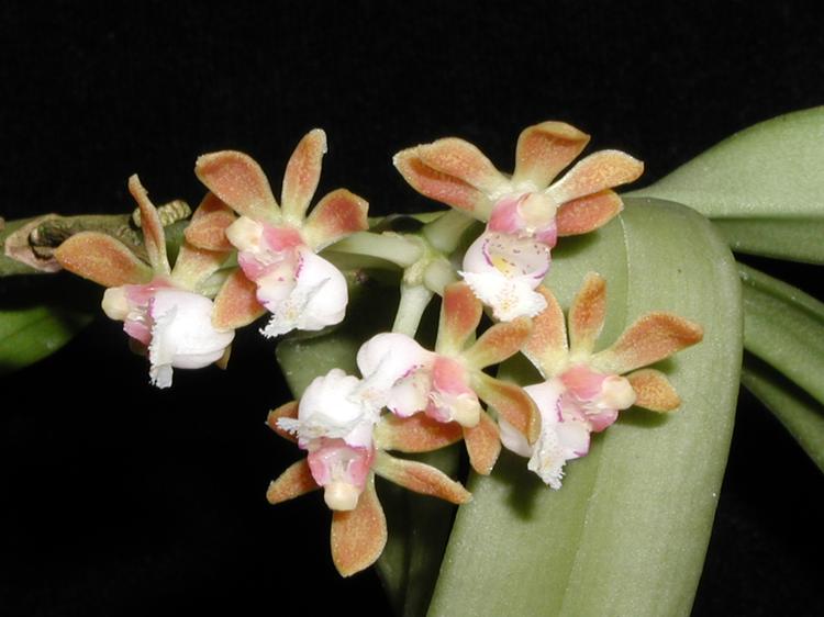 Found in Bangladesh, Thailand, Yunnan province of China, northern Laos and Vietnam in dense forests on tree trunks at elevations around 1500 to 1600 meters as a miniature sized, cool growing epiphyte with an erect stem carrying a few narrowly elliptic, obtuse, becoming conduplicate towards the clasping base leaves that blooms in the fall on an erect, from the old leaf bases below, to 2" [5 cm] long, 4 to 15 flowered, subumbellate inflorescence with ovate-triangular floral bracts.