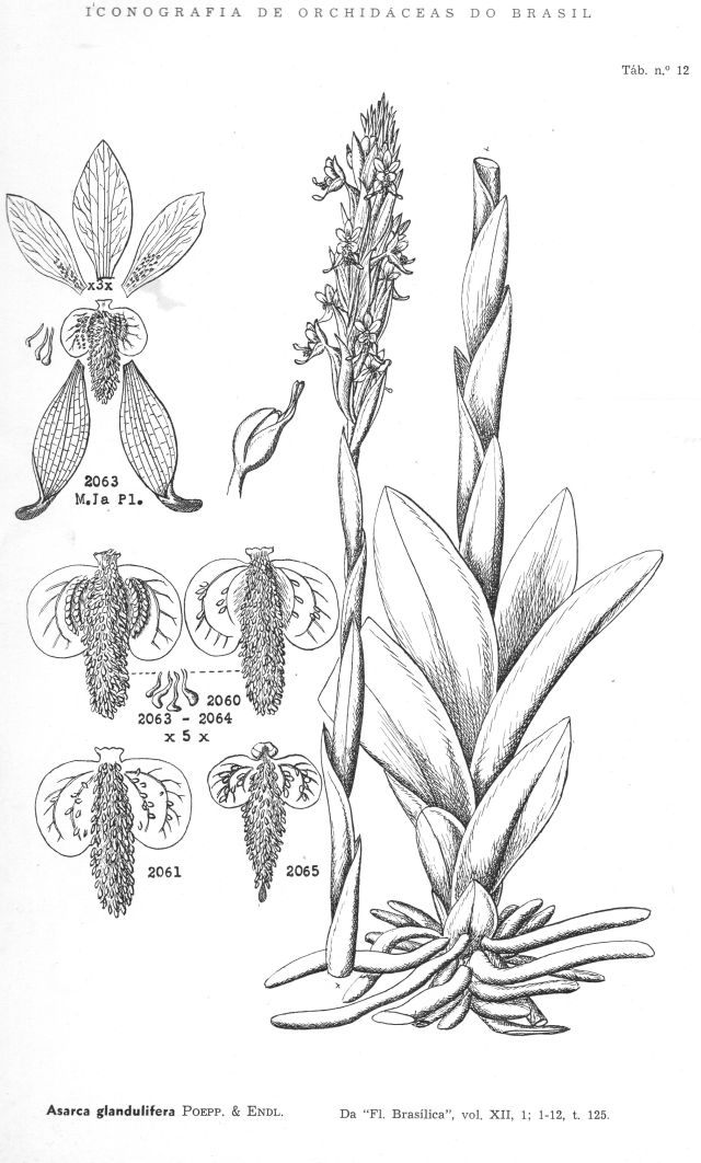 References W3 Tropicos, Kew Monocot list , IPNI ; Flora Brasilica Vol XII I Hoehne 1940 as Asarca glandulifera drawing fide; Iconografia de Orchidaceae Do Brasil Hoehne 1949 as Asarca glandulifera drawing fide 100 Orquideas Argentinas Freuler 2005 photo fide;