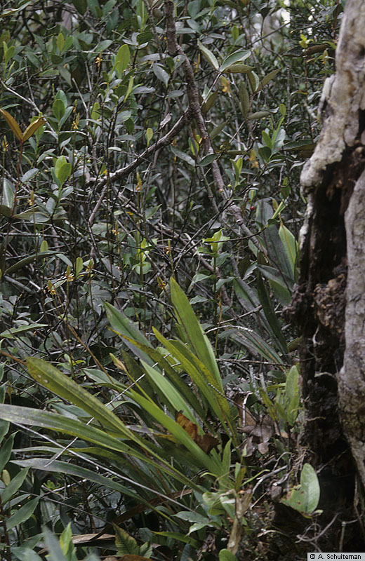 Found only in Borneo in Kerangas forests at elevations of 400 to 1000 meters as a medium sized, hot to warm growing terrestrial with tilted to the side, cylindrical, rather flattened pseudobulbs carrying 2, apical, linear-lanceolate, acute, rather stiffly coriaceous, deeply canaliculate leaves that blooms in the fall on an erect, rigid, elongating, 18 to 27.5" [45 to 68 cm] long, slightly fractiflex, successively 1 to 2, many [to 75] flowered inflorescence