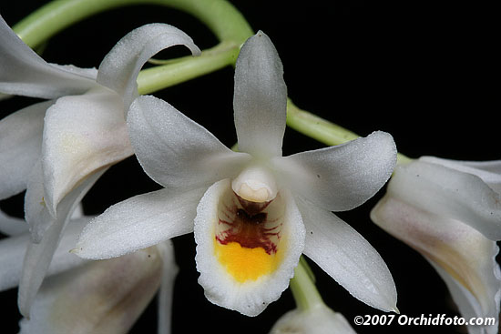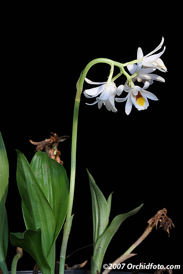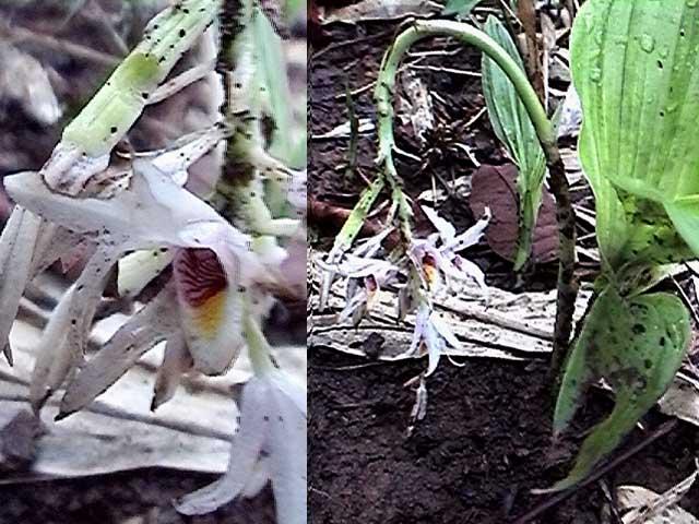 Found in Guangdong, Hainan and Yunnan China, northern Thailand and Vietnam in humid, mossy, mixed, coniferous forests, in semi-deciduous and deciduous dry lowland forests and savana-like woodlands at elevations of sealevel to 700 meters in shady, humid, habitats with rocky substrates as a small sized, hot to warm growing terrestrial species is with tuber-like, noded pseudobulbs and carrying 2 to 3, elliptic-oblong to elliptic, acuminate to shortly acuminate, petiolate base leaves that blooms in the late winter and spring on a basal, erect then sharply arching, 6 to 7.2" [15 to 18 cm] long, shorter than the leaves, many [10 to 18] flowered inflorescence with linear-lanceolate bracts.