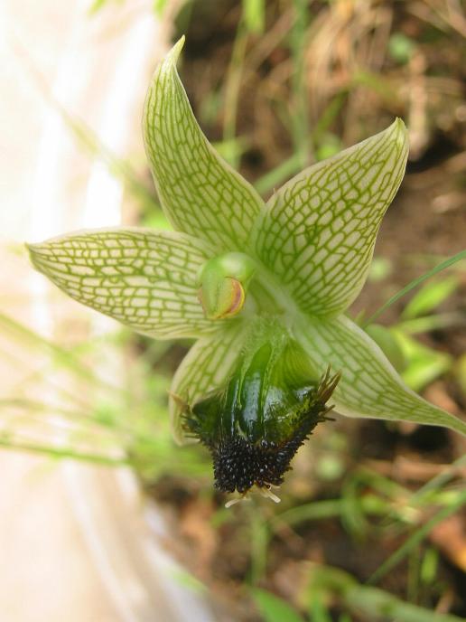 Found in Paraguay and Argentina in pampas and montane grasslands as a cool growing terrestrial orchid in rocky ground with a basal rosette of oval leaves that are not present at blooming, which is on an erect, single [rarely 2] flowered inflorescence occuring in the spring.