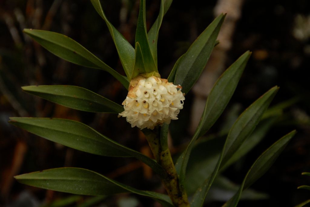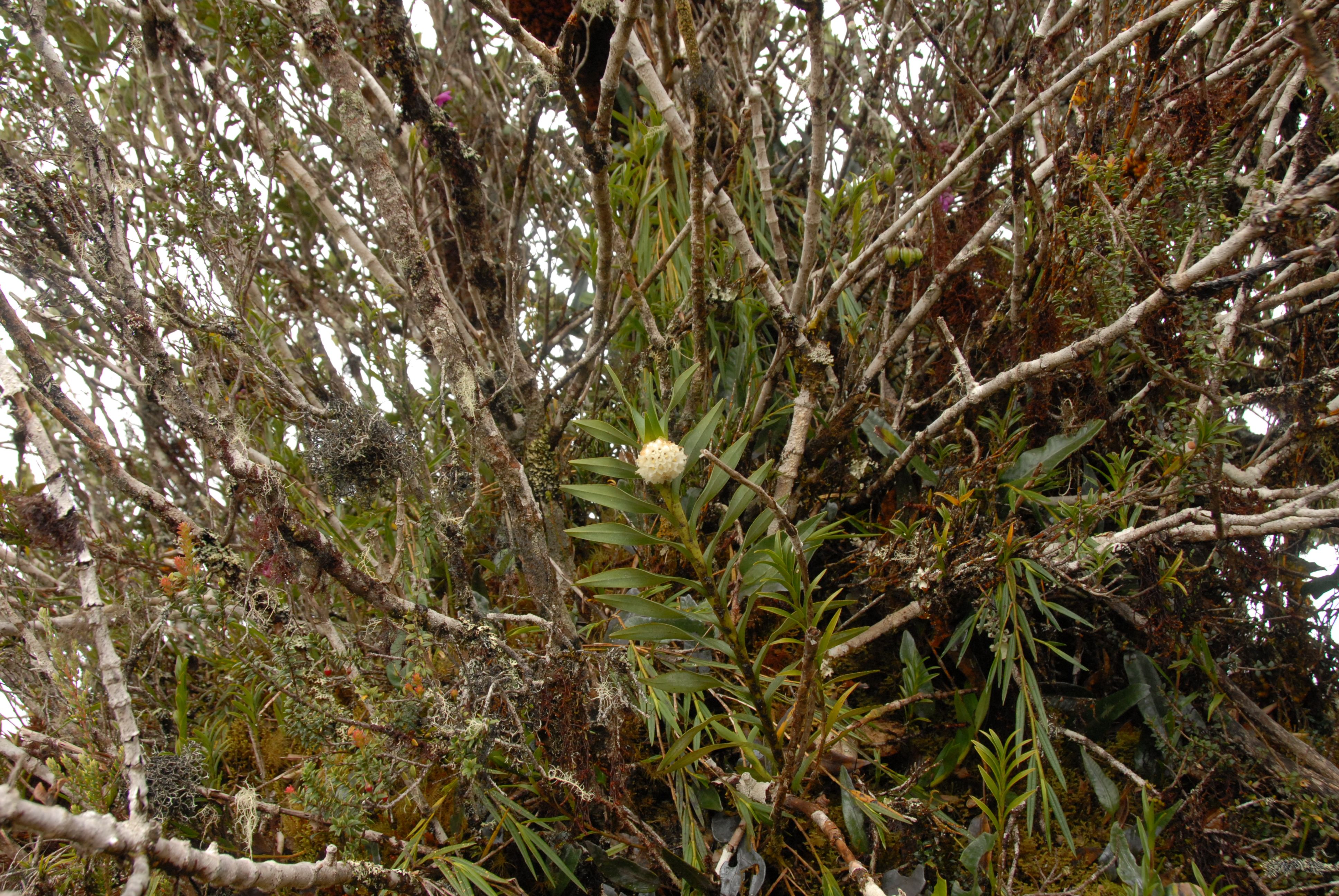 Found in New Guinea the Bismark Archipelago and the Solomon Islands in grasslands at elevations of 3200 to 3450 meters as a medium to large sized, cold growing terrestrial with an erect stem enveloped completly by imbricate leaf sheaths carrying coriaceous, glabrous, minutely transversely warty above, ovate lanceolate to lanceolate, unequally bilobed apically leaves that blooms on a terminal, corymbose, head .88 to 1" [2.2 to 2.5 cm] across many flowered inflorescence.