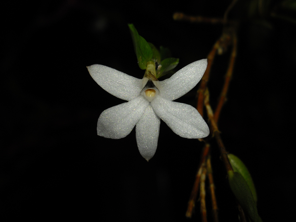 Found in New Guinea in forests on trees at elevations around 1300 meters as a small sized, cool growing epiphyte with a more or less branching, terete, densely leafy stem carrying erect-patent, linear to ligulate-linear, obliquely subacute, glabrous, thickly fleshy, narrowly subpetiolate base leaves that blooms in the fall on a short single flowered inflorescence