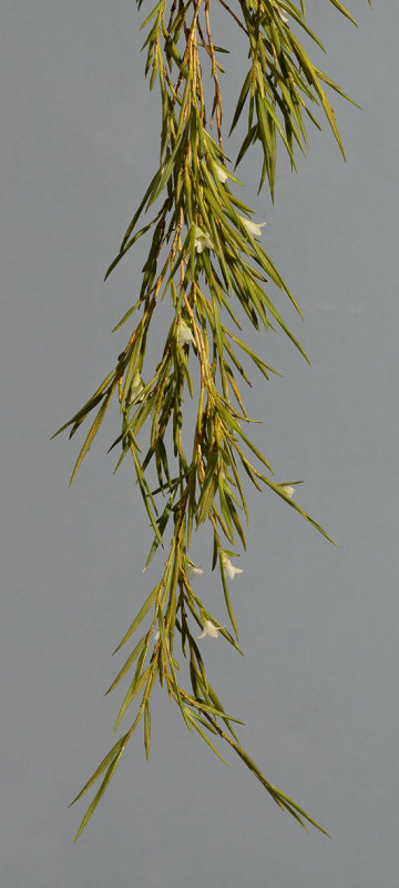 Found in New Guinea in forests on tall trees hanging in large clumps at elevations around 1000 meters as a small sized, warm to cool, pendent growing epiphyte with a pendent, much branched, filiform, terete, leafy stem carrying subulate, sharply pointed, fleshy, glabrous, basally attenuate leaves that blooms in the winter on a single flowered inflorescence